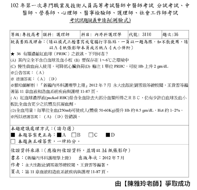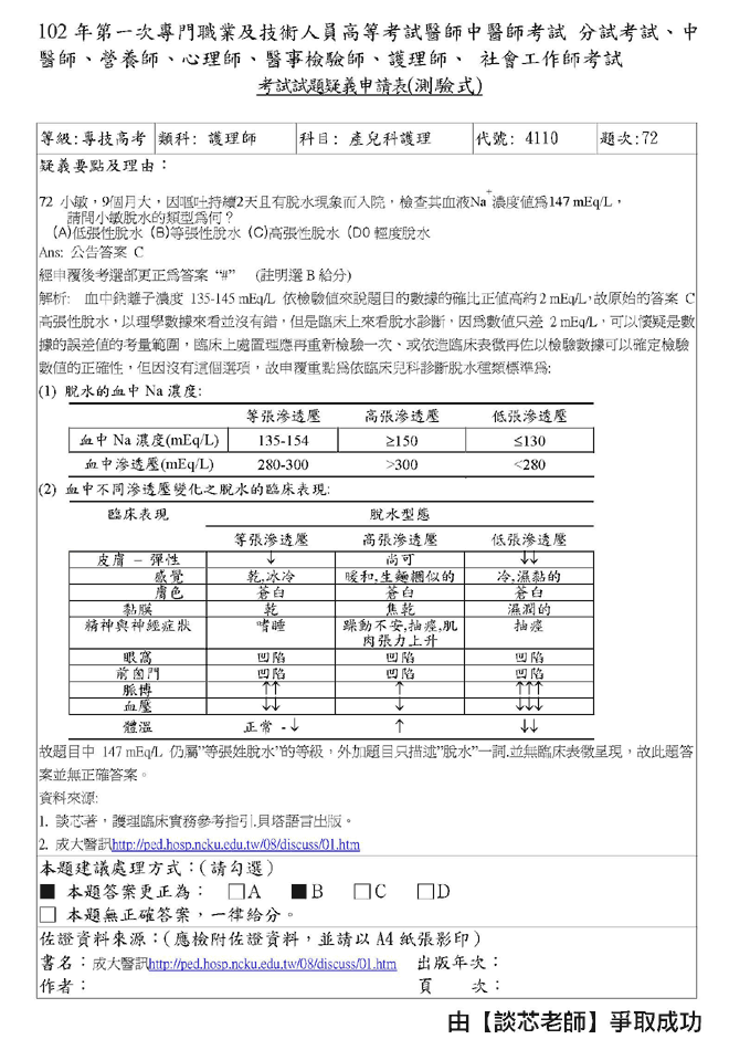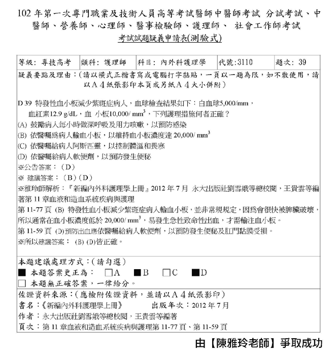 102年第一次專技高考護理師爭議題加分如下!